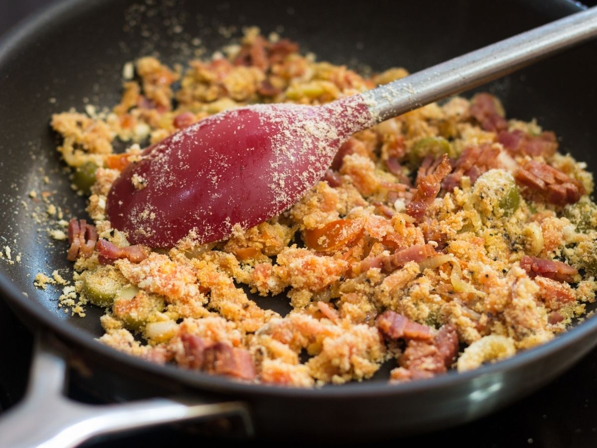 - Logo depois, acrescente o caldo de bacon, mexa até que derreta e junte a farofa pronta.